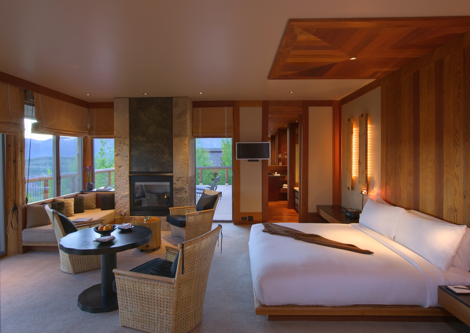 Mit ihren hohen Decken, Balkonen und großen Panoramafenstern, die den Blick auf die Teton-Berge einrahmen, sind die Suiten des Amangani mit Holz, Stein, gewebten Stühlen aus Kuhfell und Decken aus Wolfspelz eingerichtet.