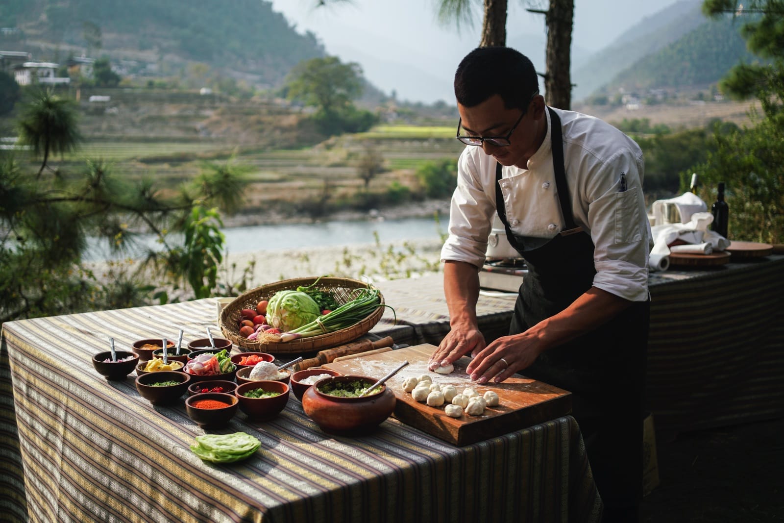 Das hoteleigene Restaurant befindet sich in dem traditionellen bhutanischen Farmhaus. Bei guter Witterung speisen Sie auf der auf der Terrasse, von der aus man einen herrlichen Blick über das Tal hat. Zudem gibt es einen Tee-Pavillion, der einst als Küche des Sommerpalastes der Königlichen Familie fungierte.