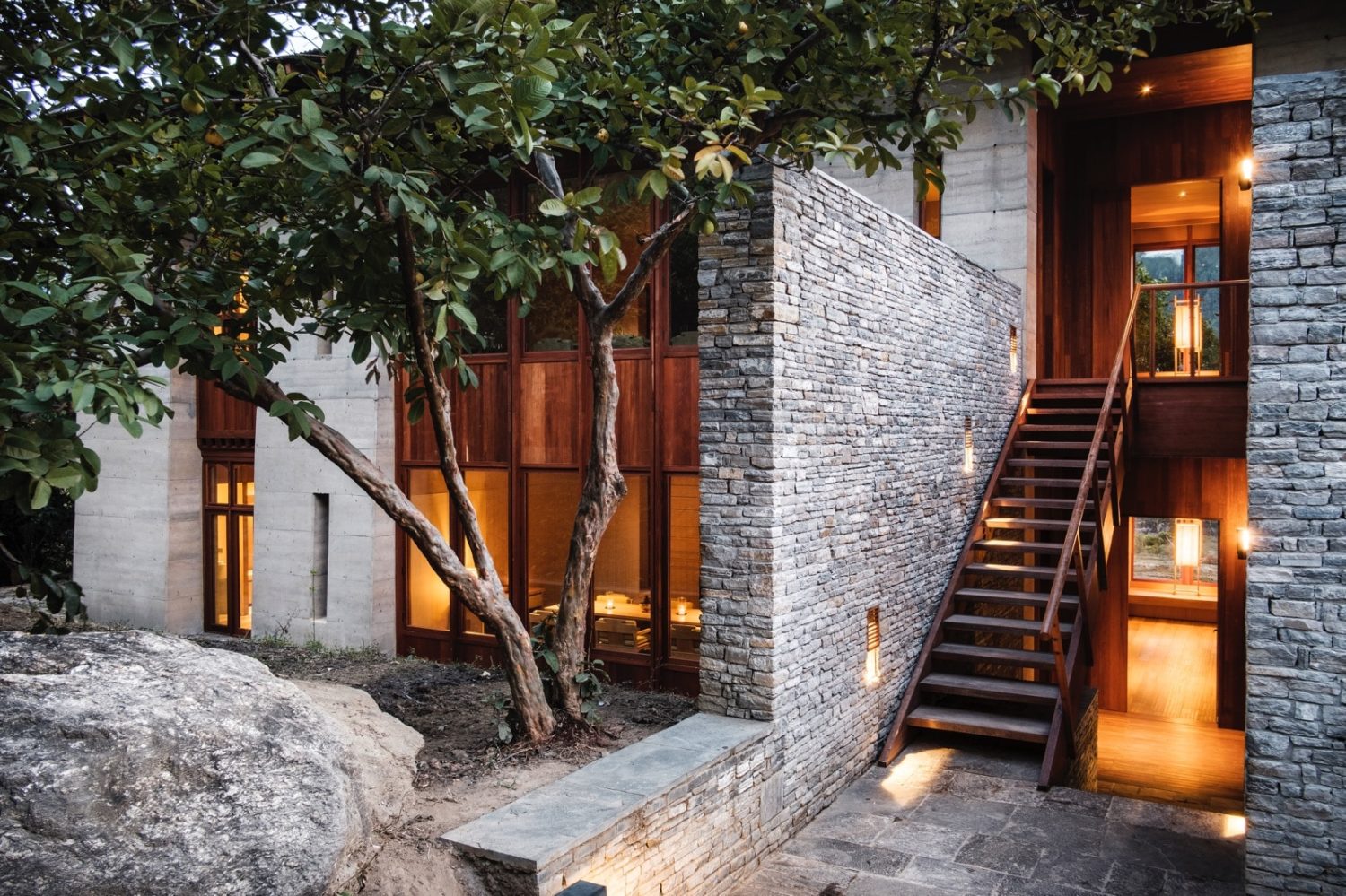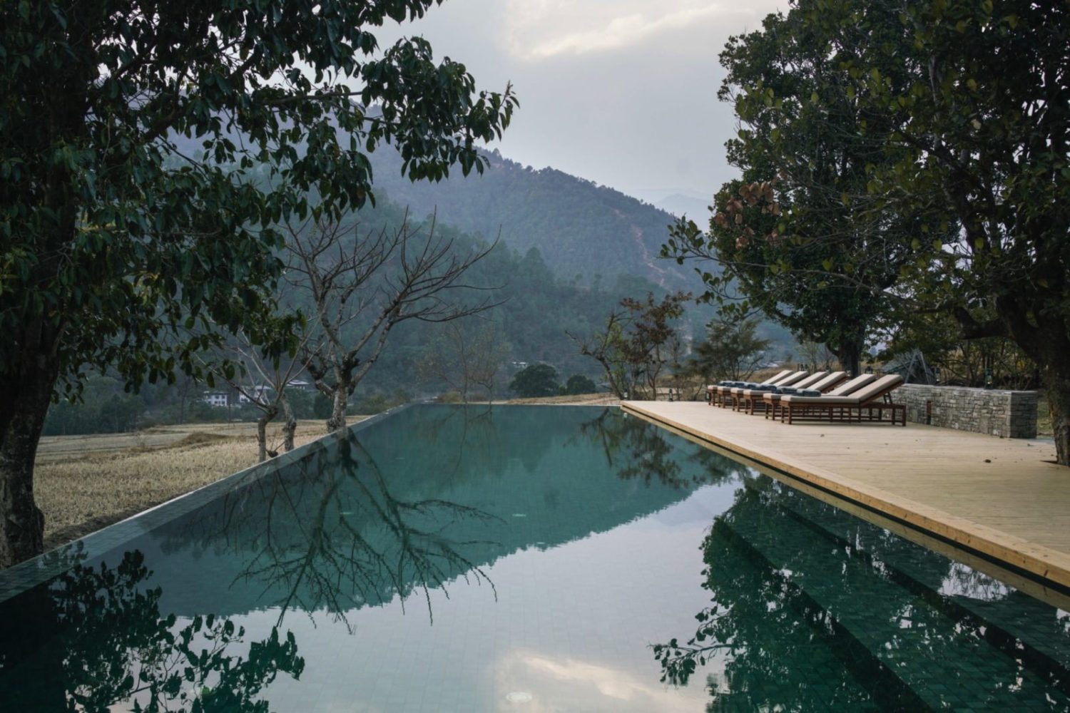 Das Resort besteht aus zwei modernen Komplexen – in denen sich die 12 Gäste-Suiten befinden – und einem traditionellen bhutanischen Farmhaus. Letzteres wurde als Sitz für die königliche Familie zur Beobachtung der umliegenden Reisfelder und Obstplantagen errichtet. Heute bildet es den Mittelpunkt der märchenhaften Hotelanlage und beherbergt das Restaurant und einen Altarraum.