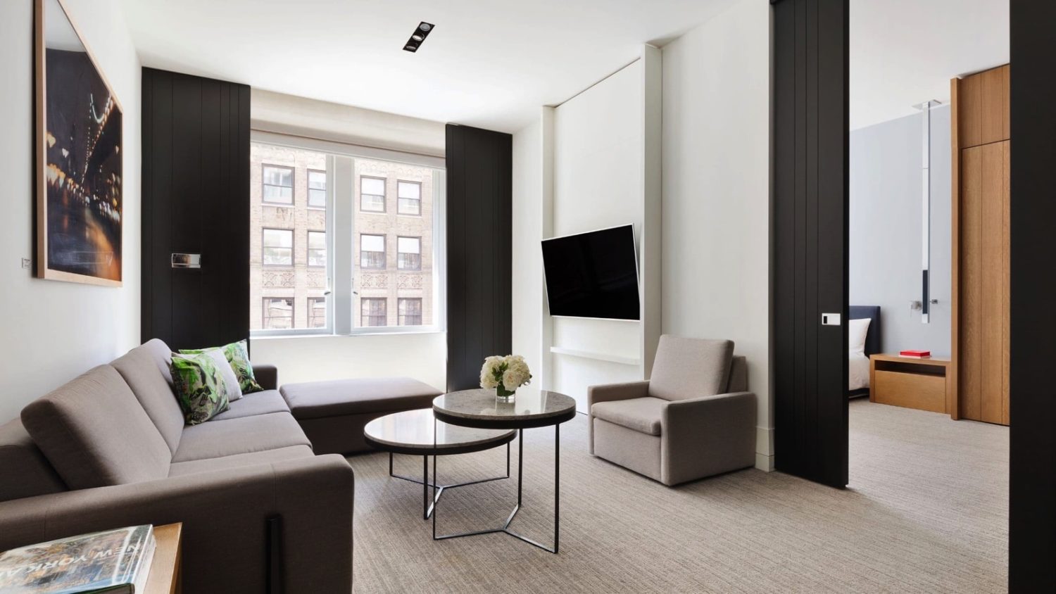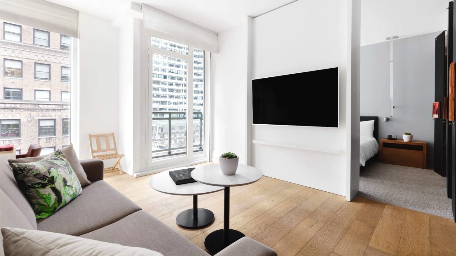 Diese offenen Suiten verfügen über ein Kingsize-Bett, ein Schlafsofa, ein geräumiges Travertin-Badezimmer mit Fußbadewanne und große Fenster mit Blick auf die 42nd Street.