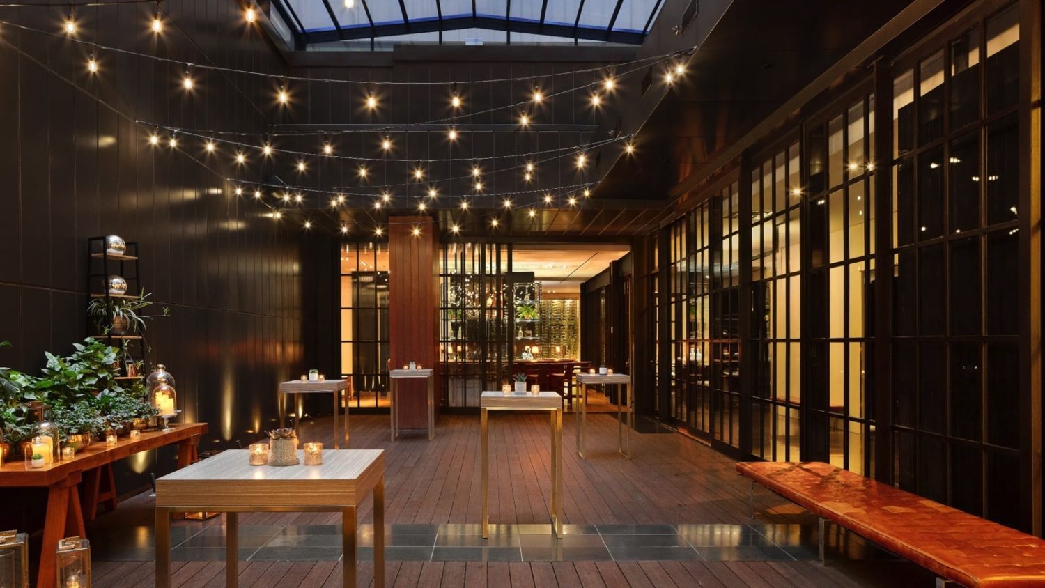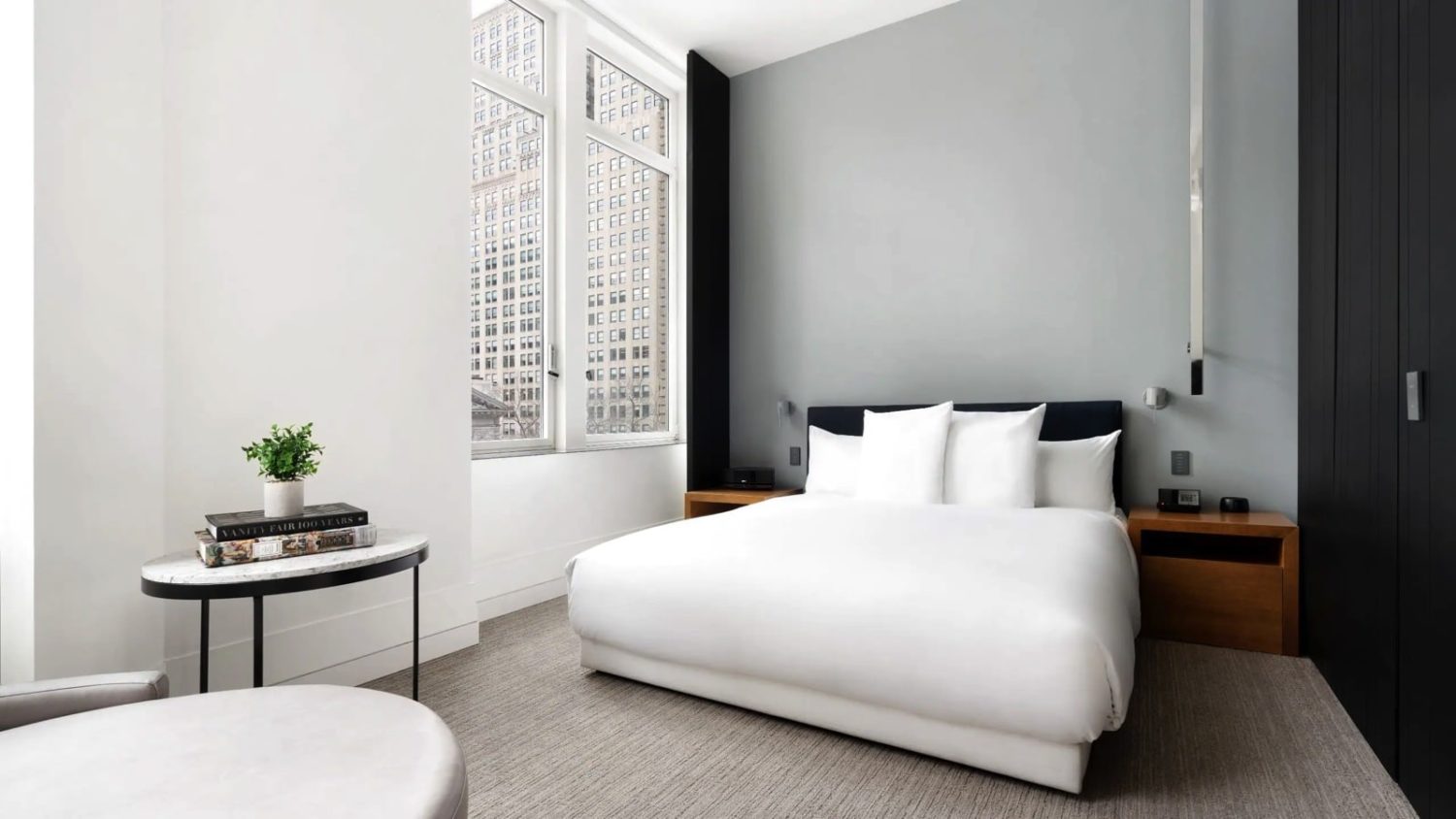 Die loftartigen Zimmer bieten ein Kingsize-Bett, hohe Decken, einen Schreibtisch, ein Travertin-Badezimmer mit begehbarer Dusche und große Fenster mit Blick auf den Veranstaltungsbereich im Innenhof des Hotels.