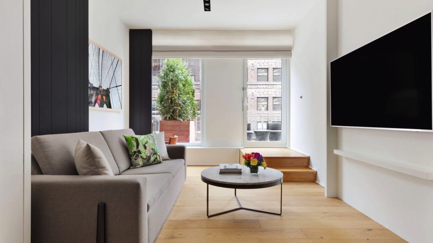 Diese Suite verfügt über ein Kingsize-Bett, einen separaten Sitzbereich mit Schlafsofa, eine Küchenzeile, ein Travertin-Badezimmer und eine möblierte Terrasse mit Blick auf die ruhige 41st Street.