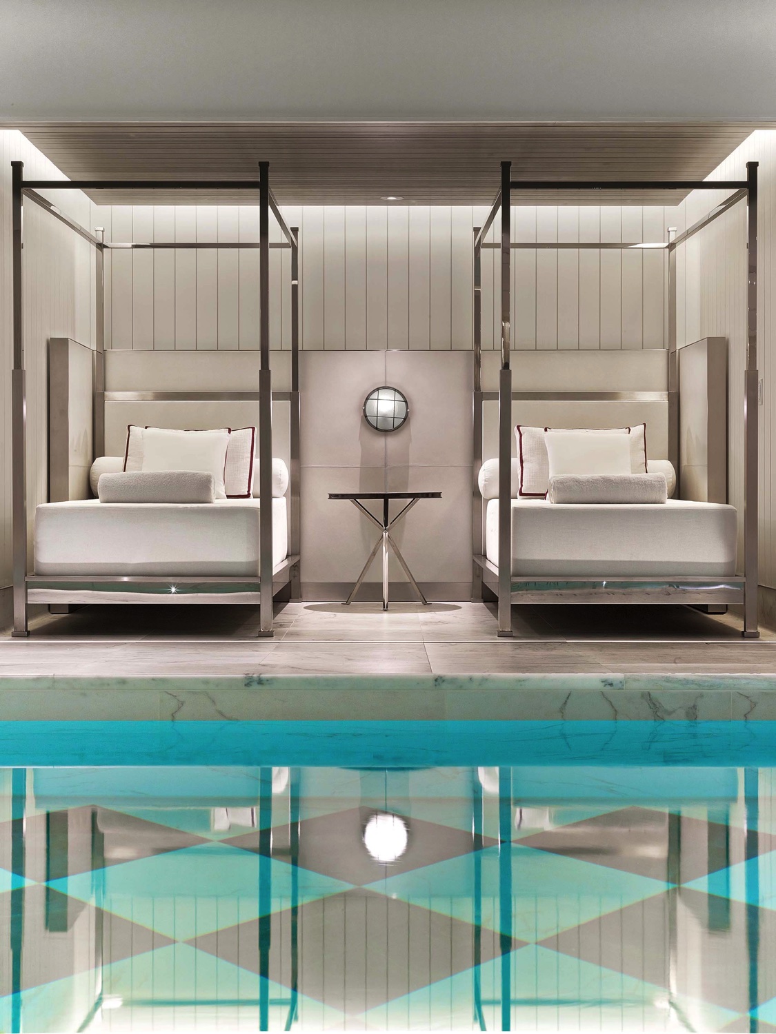 Ein beheizter Indoor-Pool, inspiriert von der Côte d’Azur, bietet Cabanas und Daybeds.