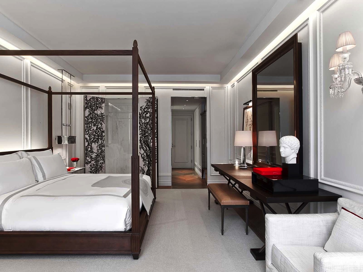 Dieses elegante Gästezimmer ist mit maßgefertigten Möbeln und Accessoires wie einem Schreibtisch, zwei Doppelbetten und Glaswandlampen ausgestattet und verbindet das edle Erbe von Baccarat mit einem stilvollen, modernen Flair. Das Badezimmer verfügt sowohl über eine Dusche als auch eine Badewanne.