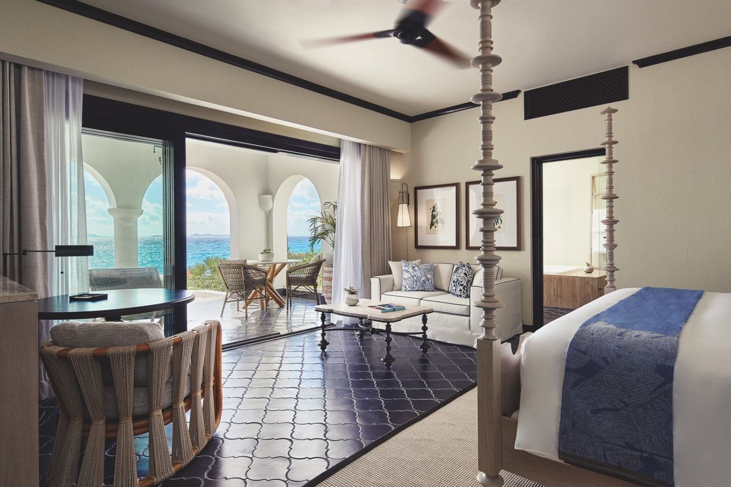 Alle der 119 vom renommierten Rottet Studio eingerichteten Zimmer, Suiten und Villen des Belmond Cap Juluca sind ein ästhetischer Genuss und warten mit den neuesten Annehmlichkeiten, einer wunderschönen Aussicht und direktem Zugang zum Strand auf. Gästen stehen in allen Unterkünften Kingsize-Betten mit Belmond-Matratzen, Smart TV, kostenloses WLAN, Telefon, 24h In-Room-Dining, Spa-Services, Bügeleisen/-brett, Private Honor Bar, Nespresso Maschine, Safe und ein 24h-Butler Service sowie Bäder mit Fußbodenheizung, separater Dusche und Badewanne, Bademänteln, Slipper und Föhn zur Verfügung. Zur Auswahl stehen folgende Kategorien: Deluxe Beachfront King Room (ca. 70 qm) mit großer überdachter Terrasse, Premium Beachfront Guestroom (ca. 73 qm) mit großer überdachter Terrasse, Solarium oder Dachterrasse, die großzügigeren, ähnlich ausgestatteten Beachfront Junior Suite King (ca. 102 qm) mit großer überdachter Terrasse und Doppelwanne im Bad, Beachfront One-Bedroom Suite (ca. 144 qm) mit großer überdachter Terrasse, separatem Wohn- und Schlafraum und Master-Bad mit Solarium sowie Gäste WC, Beachfront One-Bedroom Pool Suite (ca. 232 qm) mit großem Wohnraum, voll ausgestatteter Küche, Essbereich auf der großen Terrasse und privatem Swimmingpool, Beachfront One-Bedroom Casita Suite (ca. 139 qm) mit Familien-Essbereich, separatem WC, überdachter Terrasse, Plunge Pool, Jonquil Two-Bedroom Suite (ca. 306 qm) mit 2 Schlafzimmern, zwei Master-Bädern, geräumigem Wohnzimmer, voll ausgestatteter Küche, Essbereich mit Meerblick auf der Terrasse, Indoor- und Outdoor-Duschen und privatem Infinity Pool mit beheiztem Jacuzzi, Three-Bedroom Pool Villa (334 qm) bestehend aus einer Beachfront One-Bedroom Pool Suite mit separatem Eingang im 1. Stock und zwei Deluxe Beachfront King Rooms im EG und die Five-Bedroom Pool Villa (481 qm) bestehend aus seiner Three-Bedroom Pool Villa im 1. Stock und zwei Deluxe Beachfront King Rooms im EG.