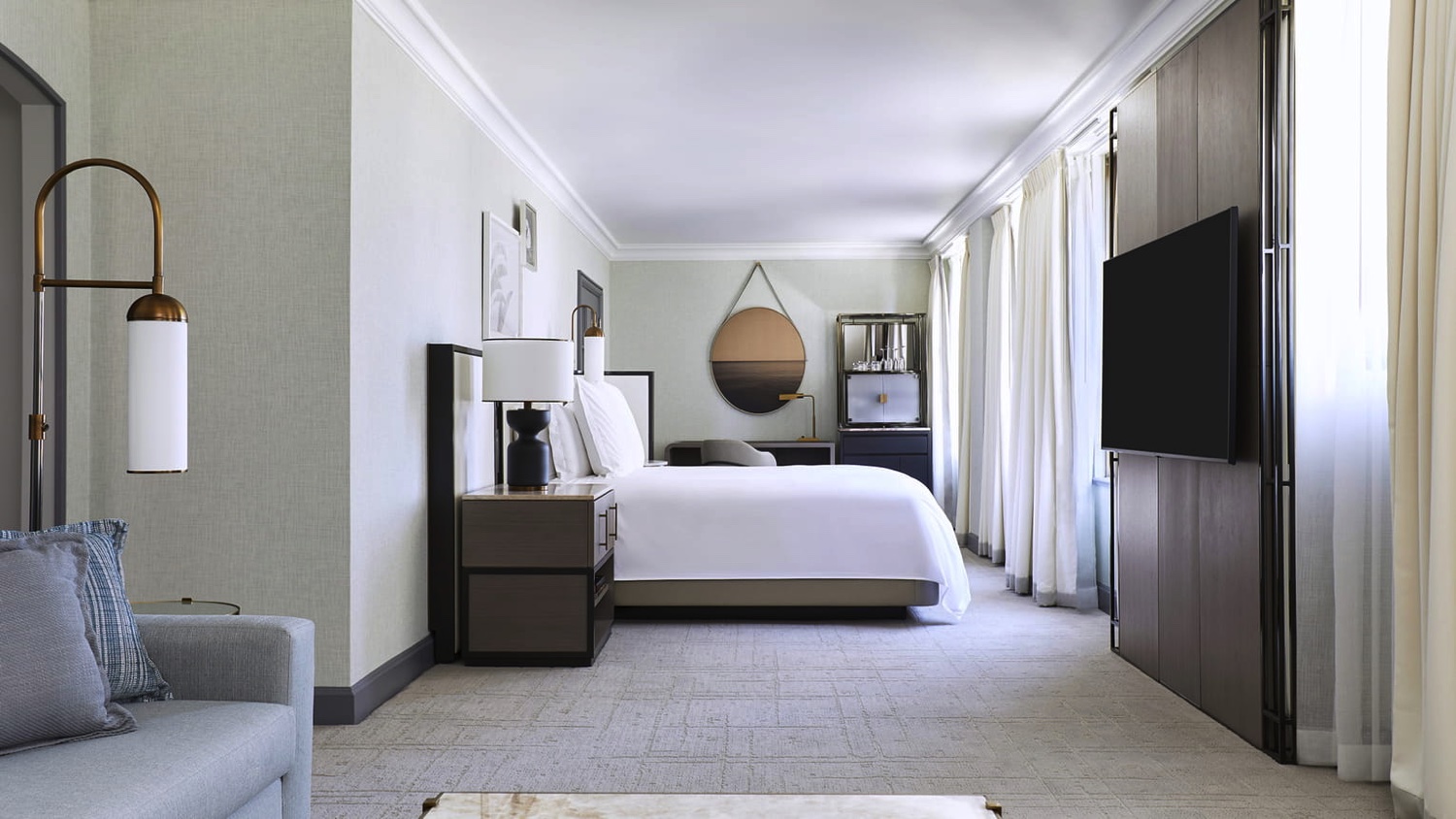 In den One-Bedroom Corner Beverly Suiten trennen Holzschiebetüren Schlaf- und Wohnzimmer, was zusätzliche Privatsphäre garantiert. Ausgestattet mit Kingsize-Bett, Schreibtisch, Sitzgelegenheit und Schlafsofa können sie auch als Drei-Schlafzimmer-Suiten konfiguriert werden.