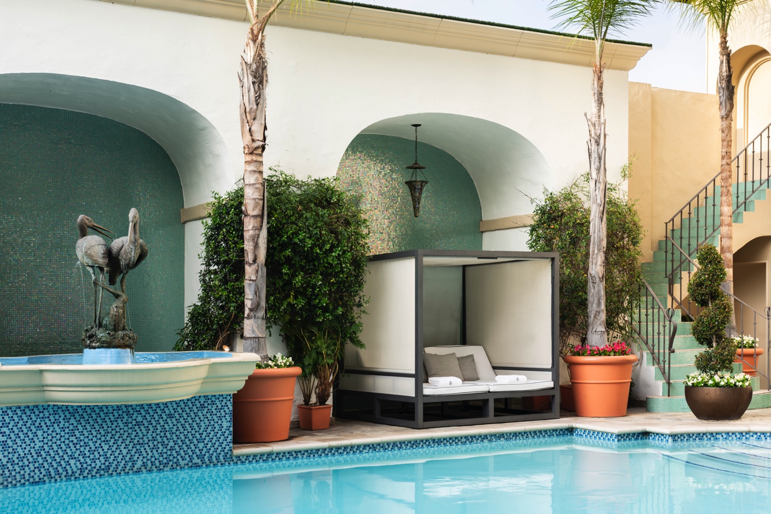 Ein beheizter, von Palmen gesäumter Außenpool bietet eine Bar sowie Liegen und Cabanas.