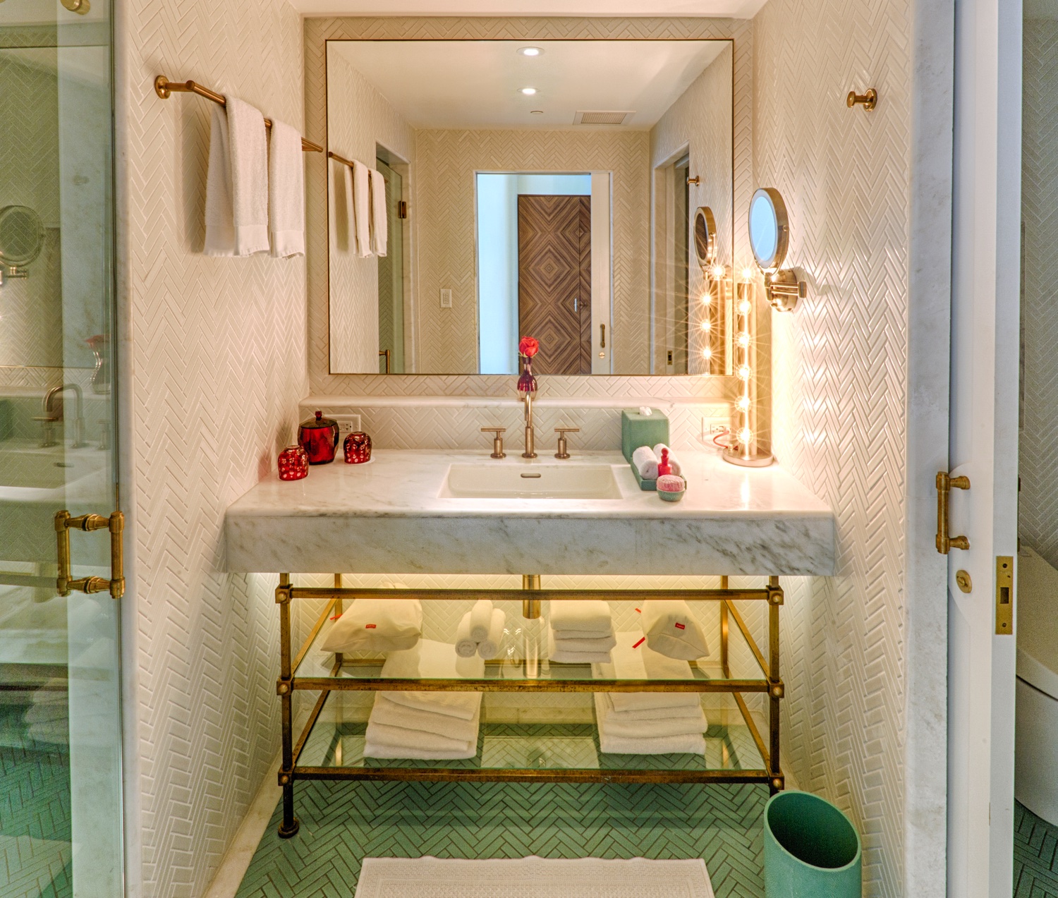 Die Suite mit vier Schlafzimmern zelebriert das goldene Zeitalter des Glamours in Miami und verfügt über vier Voll- und zwei Halbbäder, einen atemberaubenden Blick auf das Meer mit möblierten Balkonen, eine voll ausgestattete Küche und ein elegantes Wohnzimmer. Gäste genießen den typischen Faena-Butler-Service.