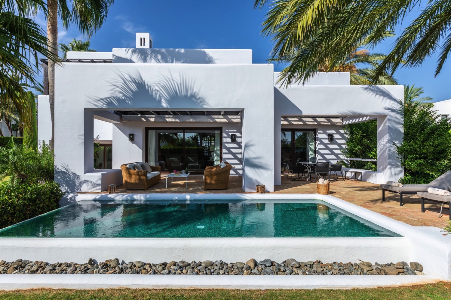 Als privater Rückzugsort mit allen Annehmlichkeiten des Hotels zeigen sich die Villen im mediterranen Stil mit vier Schlafzimmern mit Kingsize- oder Doppelbetten und eigenen Bädern, Wohnzimmer mit Kamin, voll ausgestatteter Küche, Waschküche und Gäste-WC. Im Außenbereich erwarten die Gäste offene und überdachte Terrassen, ein Garten mit privatem Pool und Parkmöglichkeiten für zwei Fahrzeuge.