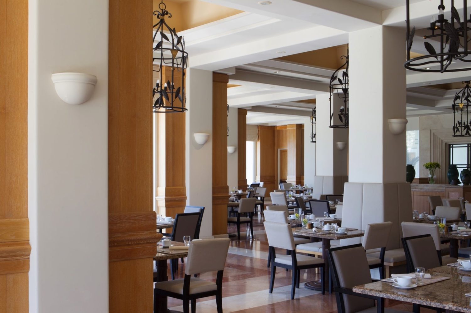 Die vier Restaurants sorgen für eine Vielfalt orientalischer und internationaler Speisen. Im Amphora wird ein täglich wechselndes Themen-Abendbuffet oder alterativ eine À-la-carte-Auswahl kredenzt. Im Helios erwarten Sie Table-d’Hôte-Menüs sowie internationale Gourmetküche à-la-carte. Das Basiliko bietet die Verschmelzung asiatischer Gewürze mit mediterranen Kräutern und das Pelagos im Poolbereich offeriert ganztägig zypriotische Gerichte und Meeresfrüchte. An einigen Abenden pro Woche findet immer abwechselnd ein BBQ oder ein zypriotisches Dorffest statt (gegen Aufpreis). Außerdem verfügt das Ferienresort über zwei Bars und eine Tee-Lounge (Die Restaurants haben zeitweise abwechselnd offen).