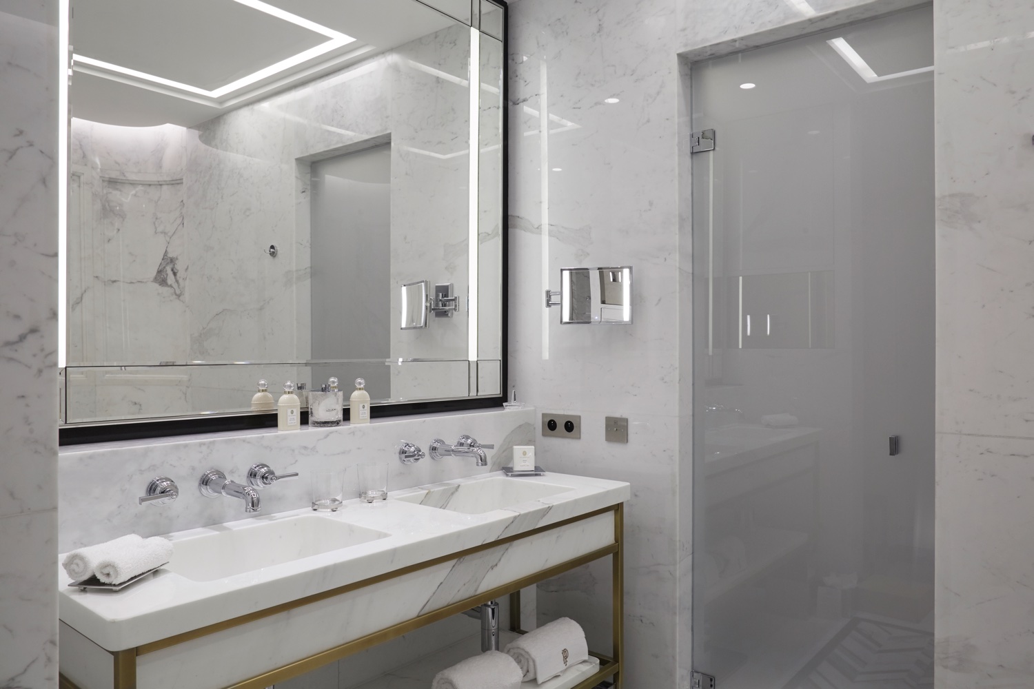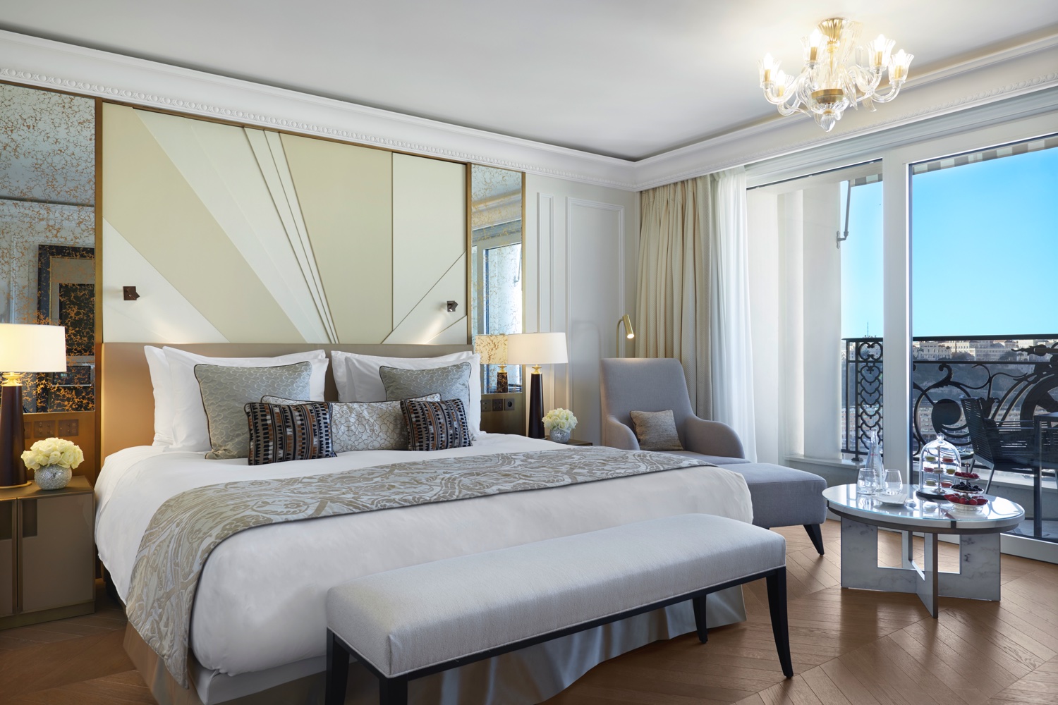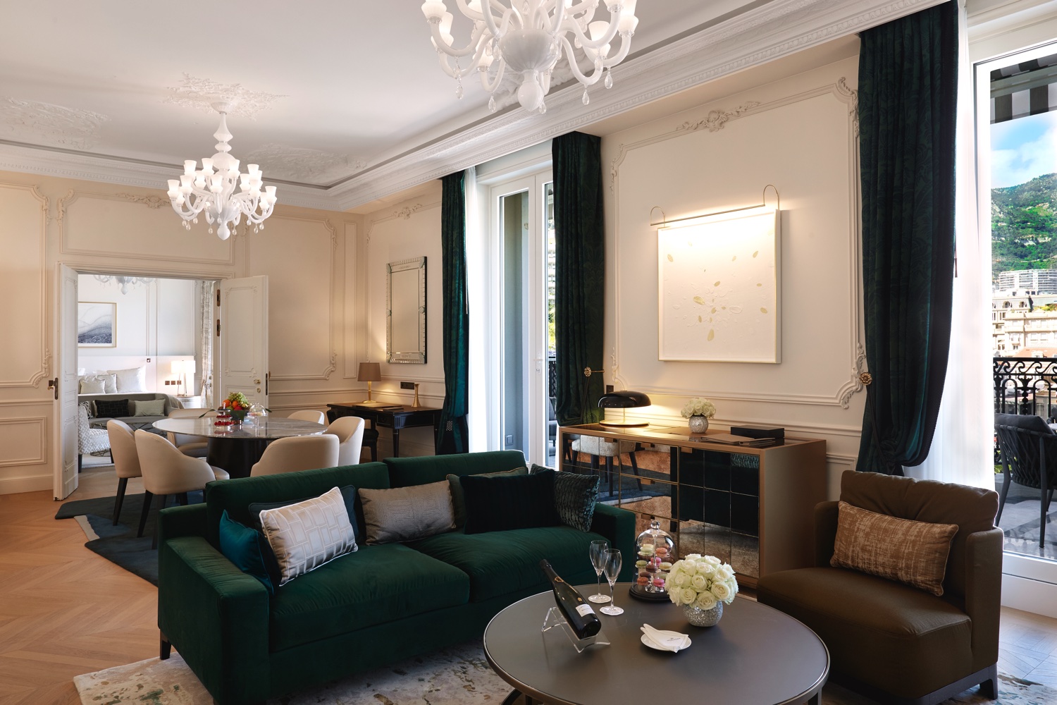 Mit zwei Schlafzimmern, jeweils ausgestattet mit Kingsize-Betten, Schreibtisch, Sitzecke, eigenen Marmorbädern und Ankleidezimmern, einem großen gemeinsamen Salon und einer Terrasse mit Blick auf das Casino bietet die Diamond Suite Garnier viel Platz und eleganten Luxus.