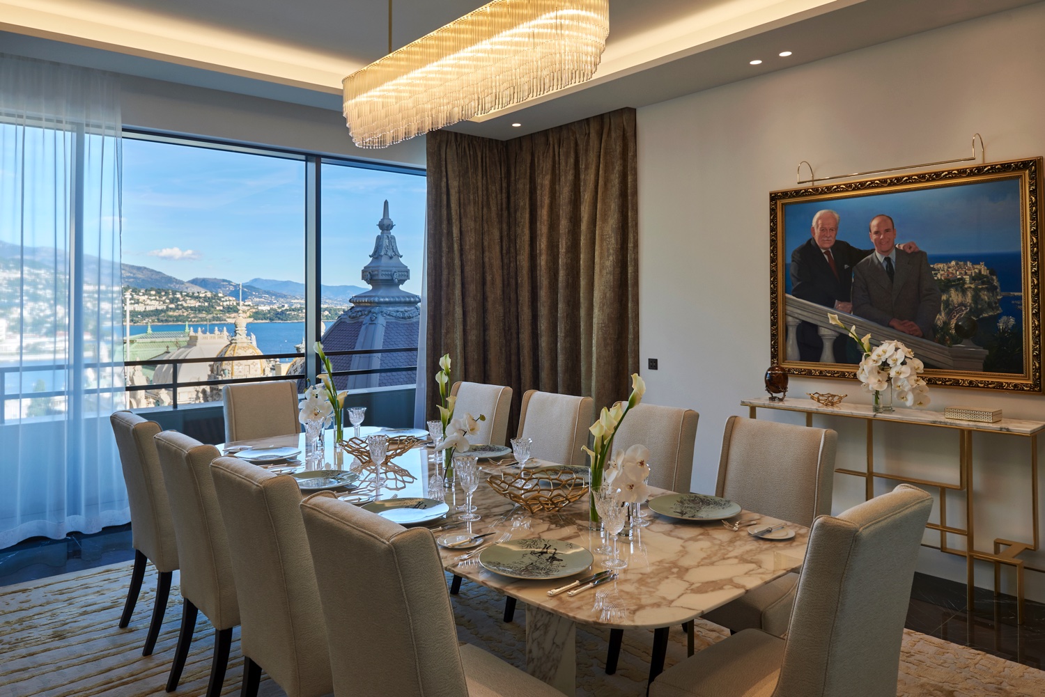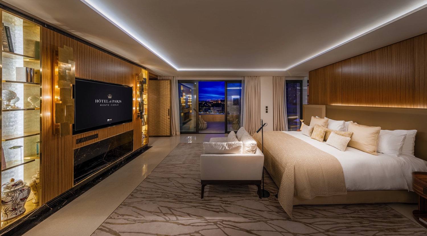 Die größte Suite im Hôtel de Paris Monte-Carlo bietet mit zwei Schlafzimmern, jeweils mit eigenem Bad, Ankleidezimmern und Wohnbereichen und der Möglichkeit, sie mit einem dritten Zimmer auf 600 qm zu erweitern, mehr Platz als jedes andere Zimmer. Es gibt einen großen Hauptsalon mit einem Barbereich, einen Salon und eine Salonbibliothek, ein Speisezimmer und einen Arbeitsbereich. Auf der 135 qm großen Terrasse befindet sich ein Infinity Pool mit Wellenanlage.