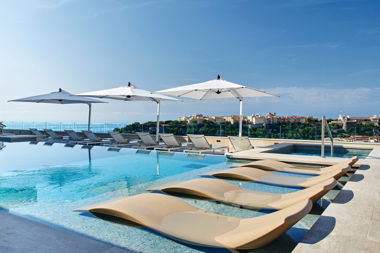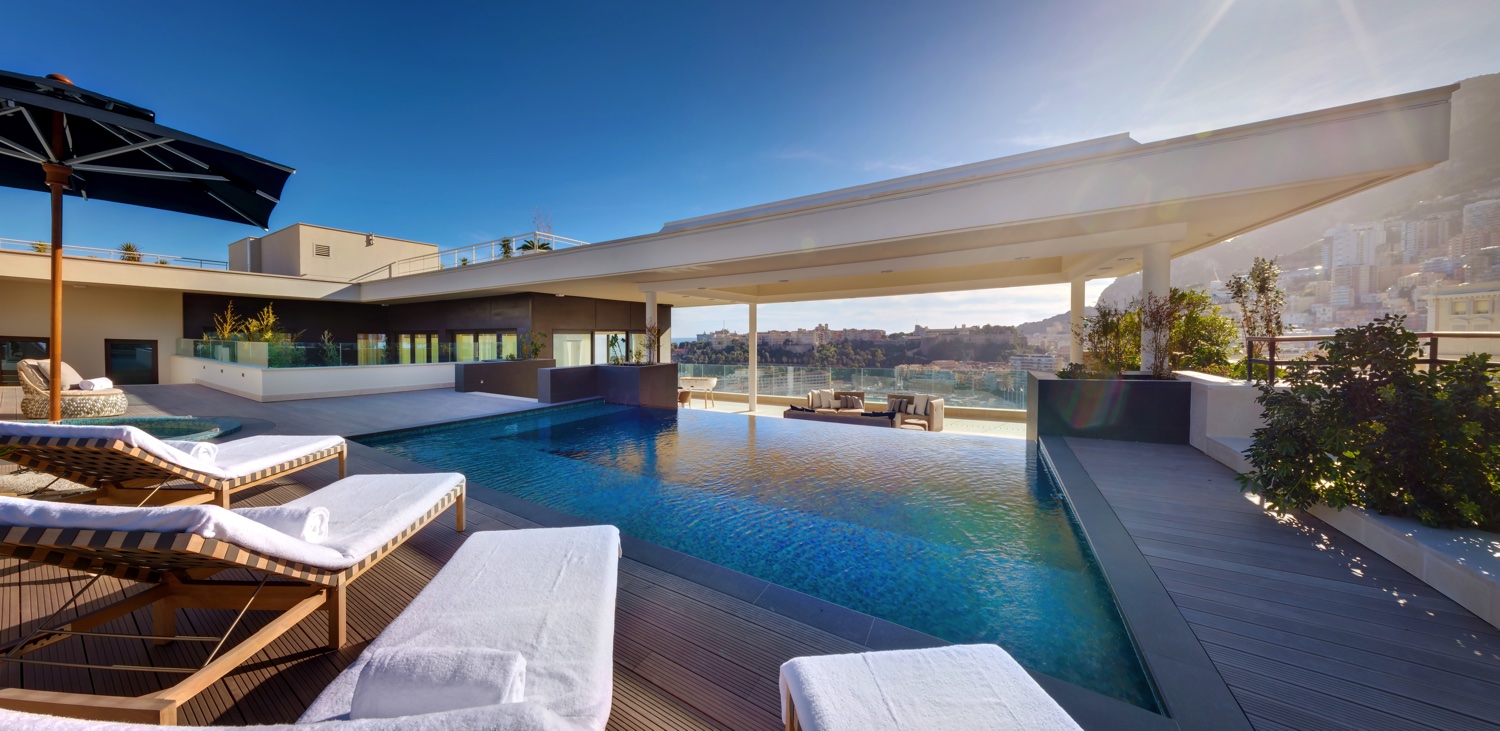 Großer Swimmingpool in der Thermes Marins in Monte-Carlo, einem Zentrum für Wellness und Gesundheitsvorsorge. Beiheizbarer Rooftop Pool im Wellness Sky Club (ab 16 Jahre) mit Liegestühlen und Cabanas.