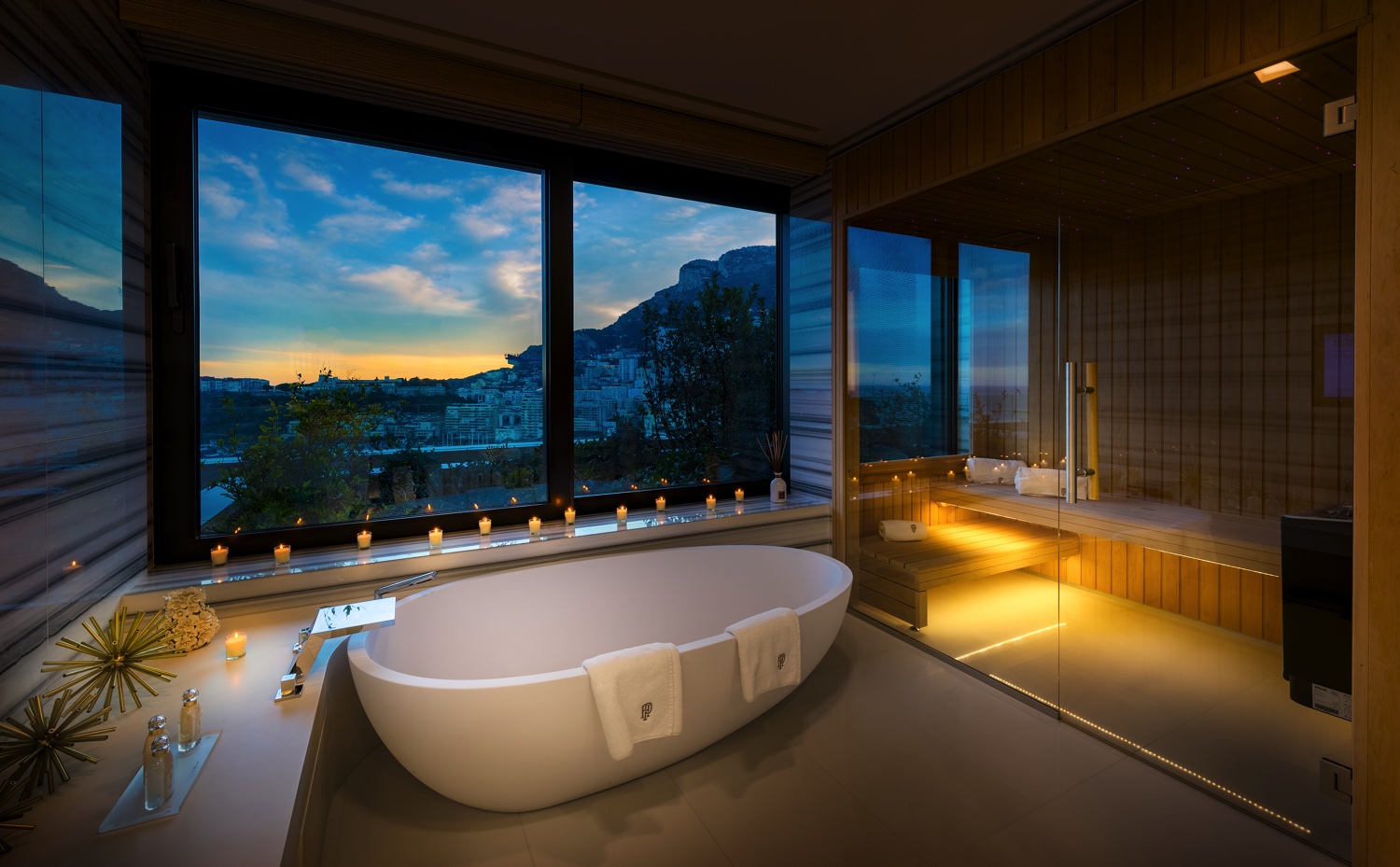 Sauna und Hammam im Wellness Sky Club. Alle Gäste haben einen direkten Zugang zu den Thermes Marins in Monte-Carlo, einem 6600 qm großen Zentrum für Wellness und Gesundheitsvorsorge mit Innenpool, diversen Saunen, Hammam und Beauty.