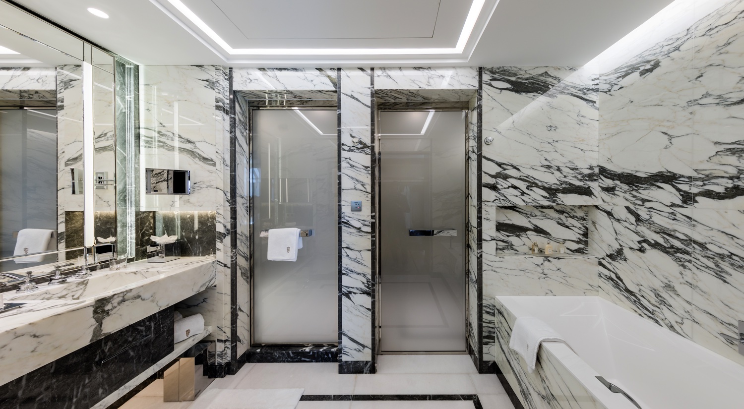 Mit zwei Schlafzimmern, jeweils ausgestattet mit Kingsize-Betten, Schreibtisch, Sitzecke, eigenen Marmorbädern und Ankleidezimmern, einem großen gemeinsamen Salon und einem Balkon bietet die Diamond Suite mit Meerblick viel Platz und einen traumhaften Ausblick.