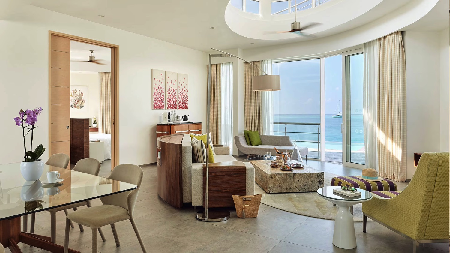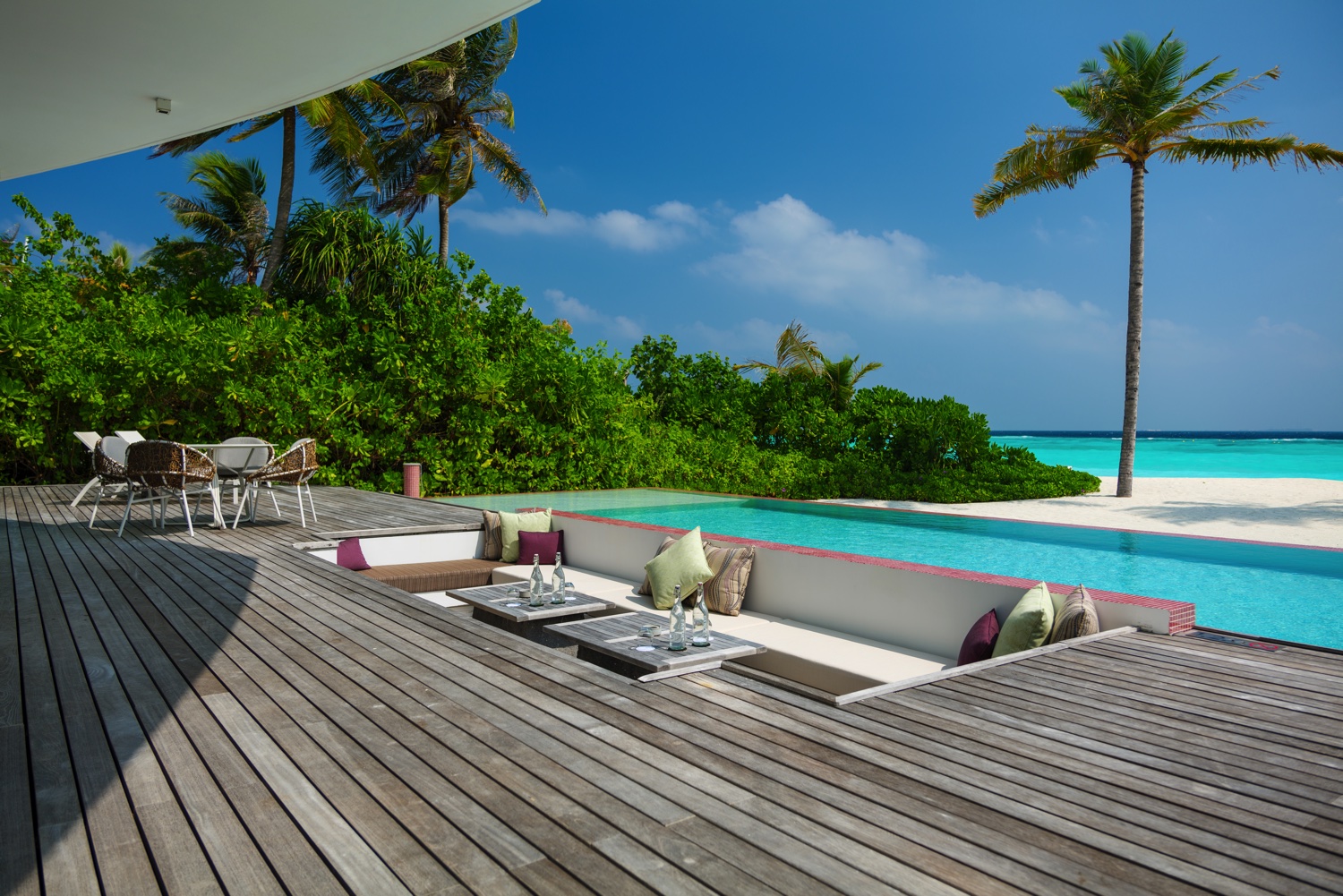 Die One Bedroom Lagunenvilla mit direktem Zugang zum Meer bietet ein Wohnzimmer und einen Essbereich für die ganze Familie, ein Schlafzimmer mit Kingsize-Bett und einen privaten Infinity Pool.