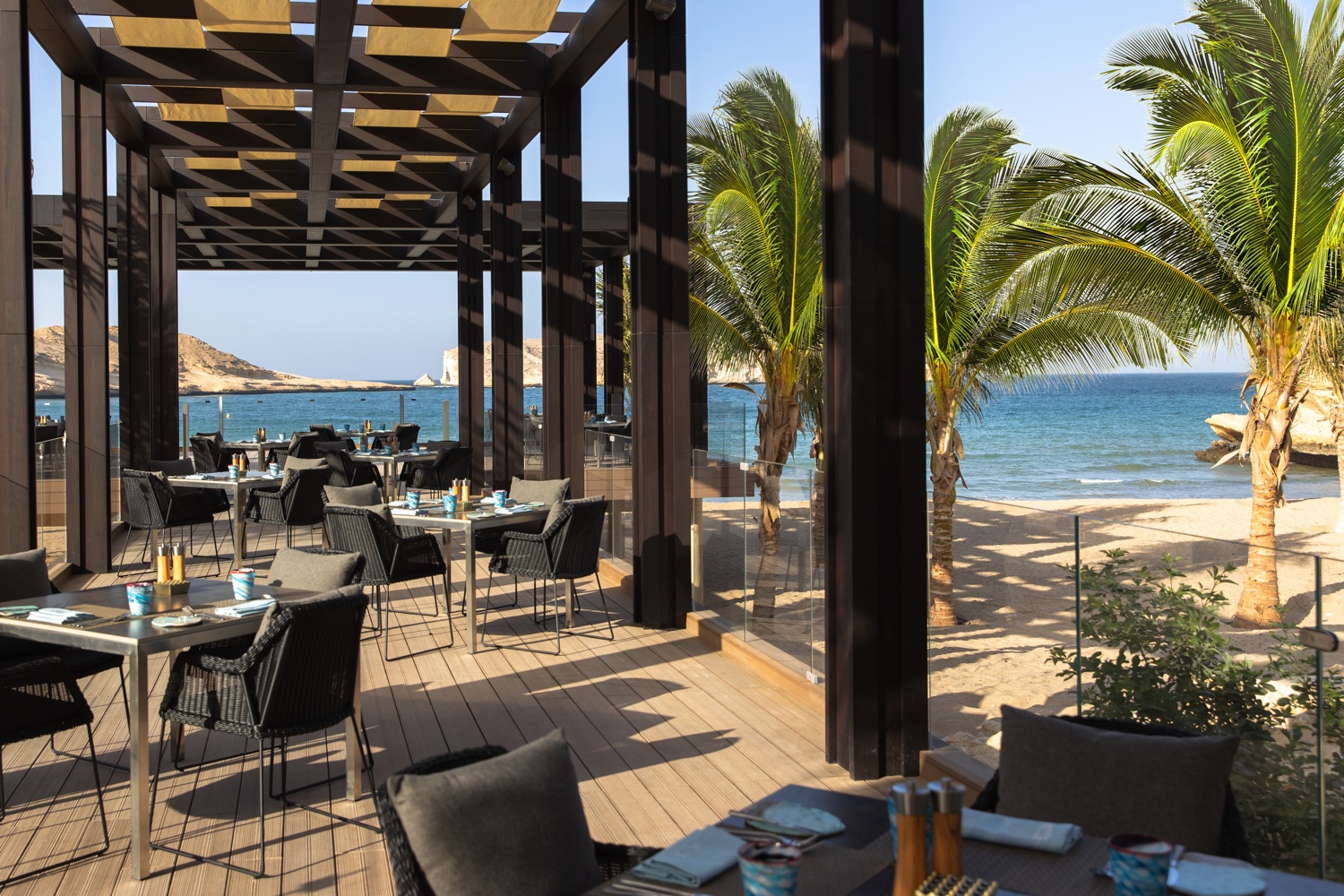 Brezza Signature Restaurant & Bar – cooles, modernes mediterranes Lokal mit dem besten Meerblick in Muscat. Hier werden von mittags bis abends exquisite Meeresfrüchte im Sharing-Stil und atemberaubende kulinarische Kreationen sowie die berühmten Jumeirah-Mixgetränke serviert.