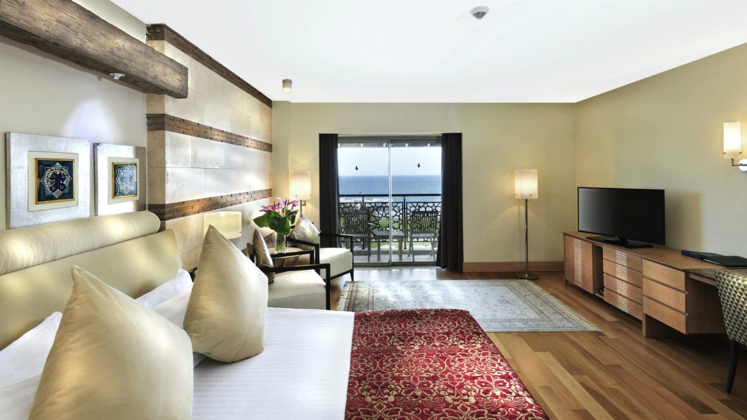 Die 164 Zimmer im Hauptgebäude und 19 Villen auf dem Golfplatz wurden dezent-elegant in zarten Farben und mit Parkettböden gestaltet und bieten ein Höchstmaß an Komfort. Die Superior Partly Seaview-Zimmer (ca. 38 qm) sind mit Klimaanlage, Marmorbad mit separater Dusche und Föhn, Telefon, einer Sitzecke, Satelliten-TV, Internetanschluss, Minibar und Zimmersafe ausgestattet. Zudem finden Sie hier einen Balkon mit teilweisem Blick auf das Meer. Ebenso verfügbar mit Blick auf den Golfplatz oder Garten bzw. als Deluxe Seaview-Zimmer (ca. 38 qm) mit phantastischen Meerblick bei ansonsten gleicher Ausstattung. Die One Bedroom Suite Seaview bzw. Golfview (jeweils ca. 76 qm) besteht aus einem Wohnzimmer und einem Schlafzimmer mit darüber hinaus separater Toilette. Viel Platz bietet die Royal Golf Villa (ca. 120 qm) mit je 2 Schlafzimmern und Bädern, Whirlpool, Kitchenette und Terrasse mit Zugang zu einem Privatpool für 2-3 Villas. Außerdem sind hier ein Golfcart sowie Butlerservice inklusive.