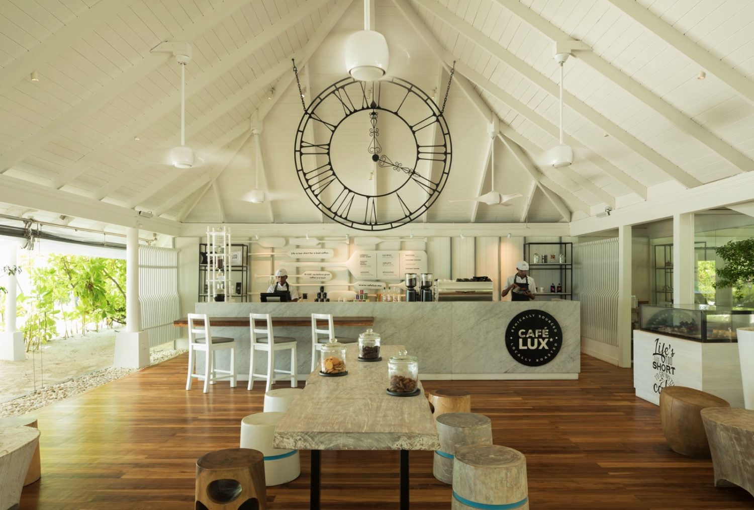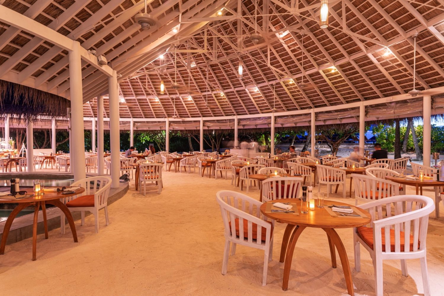 Sieben Restaurants sorgen für kulinarischen Genuss: das am Strand gelegene Hauptrestaurant MIXE präsentiert internationale Küche in Form von Themenabenden. Das Senses mit herrlichem Blick über die Lagune bietet orientalische Köstlichkeiten, während das East Market auf Stelzen über das Wasser gebaut ist und die Gäste mit asiatischen Spezialitäten versorgt. Im Umami werden japanische Spezialitäten an offenen Kochstationen zubereitet, wie auch im Allegria, das auf italienische Gerichte spezialisiert ist. Das Veli und das Dine Outlet Lux Caffee bieten kleine Snacks. Letztlich bietet das Beach Rouge das Dolce Vita eines Beach Clubs. Außerdem lädt ein DJ im Beach Rouge zum Aufbleiben ein.