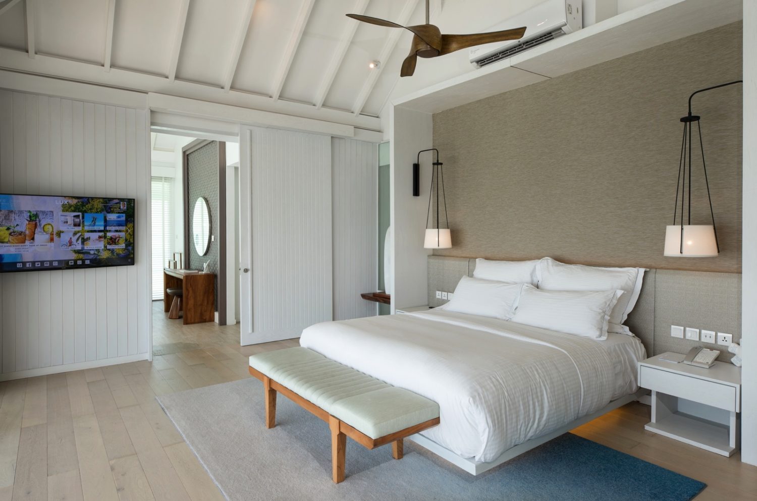 Insgesamt sind in der Hotelanlage 193 Bungalows und Villen weitläufig verteilt. Alle Bungalows und Villen sind ausgestattet mit Sitzgelegenheit, Bad mit Badewanne/WC, separater Außendusche, Föhn, Bademantel, TV (Flachbildschirm), Telefon, kostenfreiem Internetzugang, Klimaanlage, Minibar, Kaffee-/Teezubereiter, Safe und Terrasse. Zur Auswahl stehen folgende Kategorien: Die 48 Beach Pavillons (60 qm) mit 2 Einheiten direkt am Strand an der schmalsten Stelle der Insel gelegen. Die 45 Beach Villen (95 qm) – freistehende Bungalows, direkt am Strand gelegen – sind etwas geräumiger und luxuriöser eingerichtet. Die 12 Beach Pool Villen (116 qm) verfügen zudem über einen kleinen Pool und einen größeren Gartenbereich mit offenem Bad. Die 38 Water Villen (98 qm) sind auf Stelzen in die Lagune gebaut und bieten ein separates WC und eine Terrasse mit privatem Zugang zum Meer. Drei Temptation Water Villen haben auf 220 qm Platz für ein Schlafzimmer und ein Wohnzimmer. Zudem gibt noch 46 Romantic Pool Water Villen (110 qm) mit direktem Zugang ins Wasser, Terrasse mit Privatpool, Außendusche, Love Nest-Hängesessel und Blick auf die Lagune, stylishem Schaf- und Wohnzimmer, großem Bad mit Meerblick und separater Doppel-Regendusche. An der Spitze der Prestige Wasservillen befindet sich die einzige LUX Villa (360 qm).