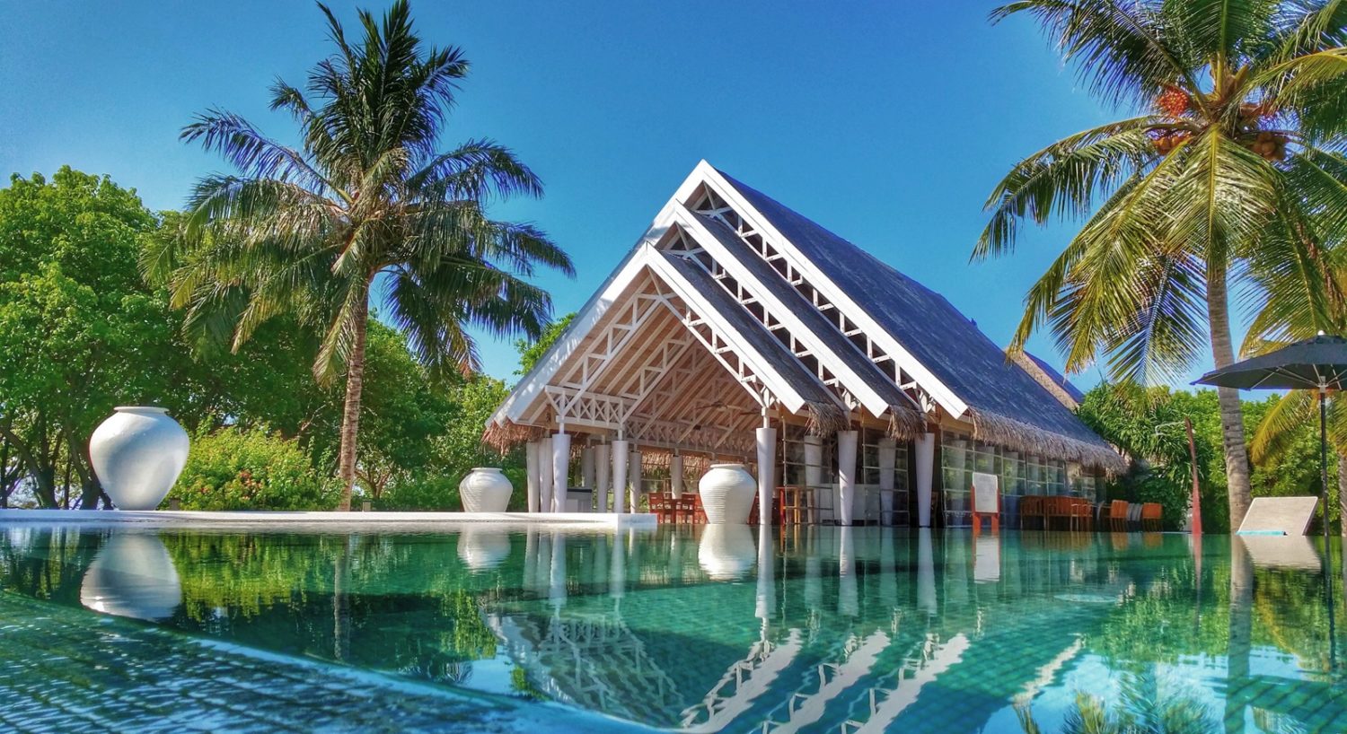 Die beiden am Westende der Insel gelegenen Infinity-Swimmingpools mit Liegen und Sonnenschirmen laden zum Abkühlen ein. Badetücher an Pool und Strand stehen den Gästen zur freien Verfügung.