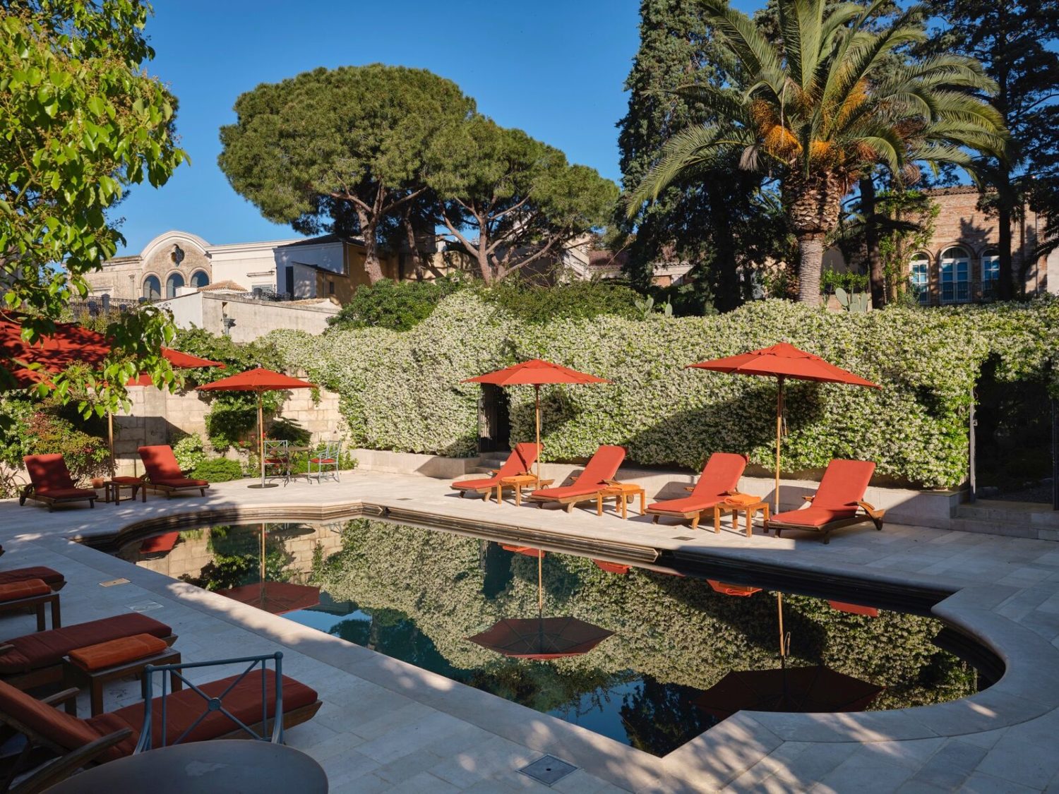 Im üppig blühenden Garten des Palazzo Margherita können Gäste zwischen Obstbäumen und plätschernden Springbrunnen am Pool entspannen.