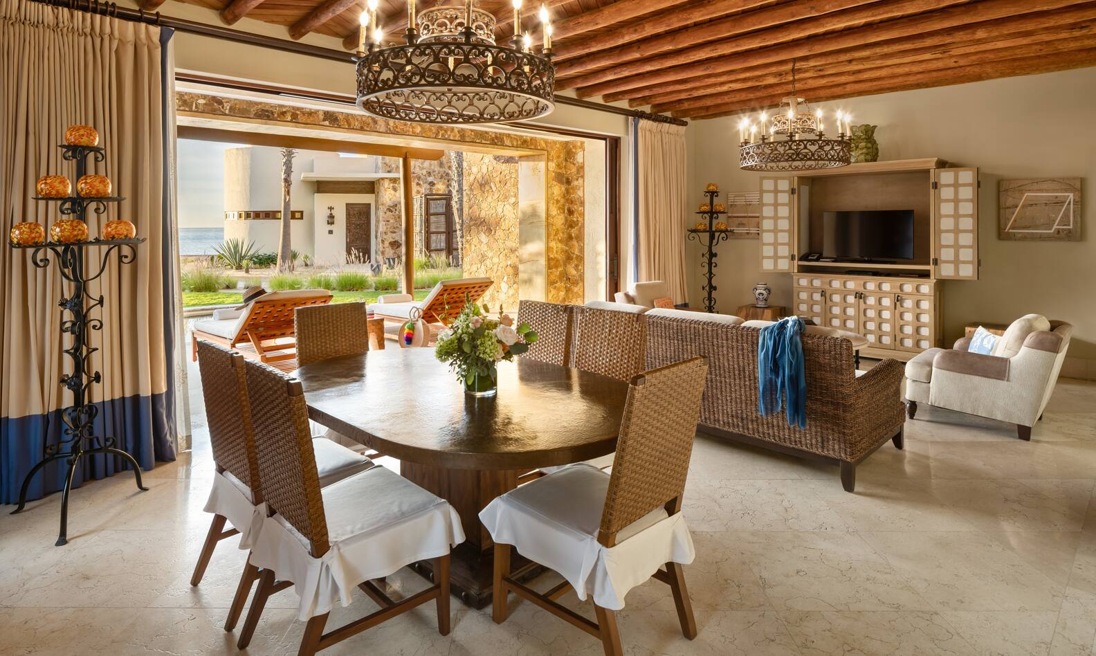 Fast 400 qm puren Luxus bietet die Presidential Beachfront Suite mit offenen Wohn- und Essbereichen, zwei geräumigen Hauptschlafzimmern und einem Doppelschlafzimmer mit Doppelbett, die jeweils über eine Sitzecke, ein Spa-ähnliches Marmorbad und traditionelle mexikanische Design-Elemente verfügen. Große Terrassen und Rasenflächen, ein Pool und ein privater Strandzugang bieten viel Platz im Freien.