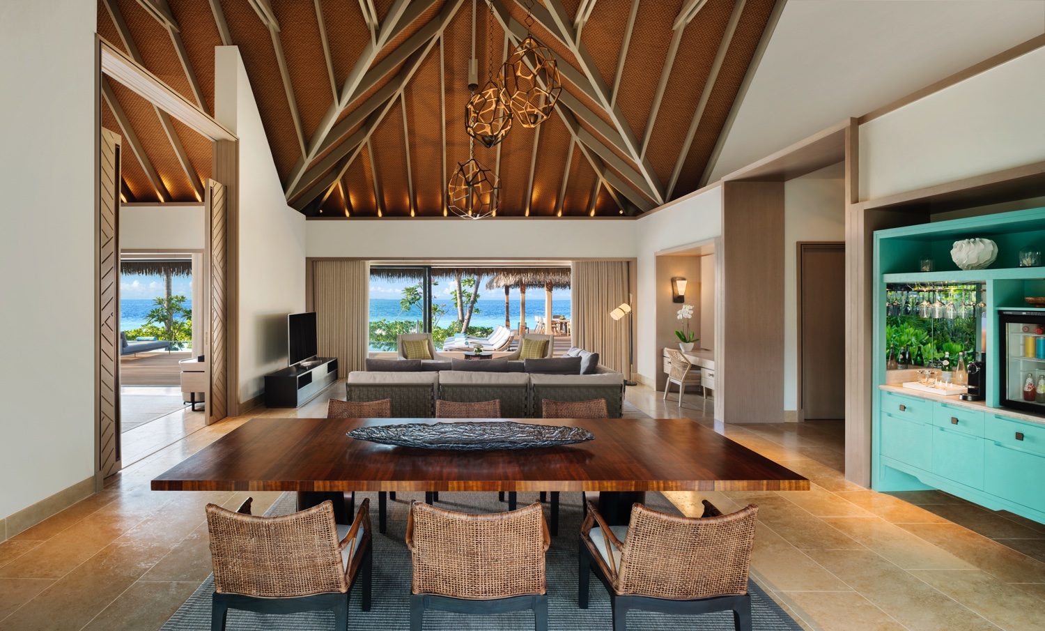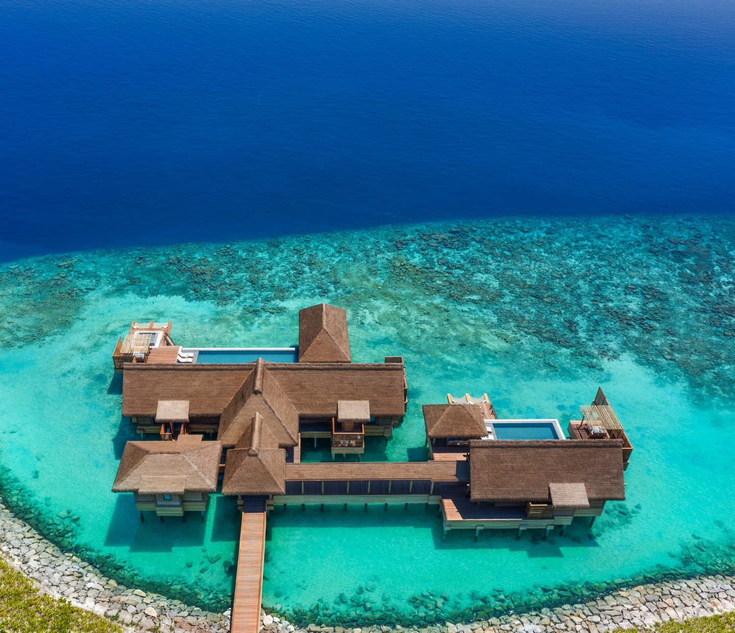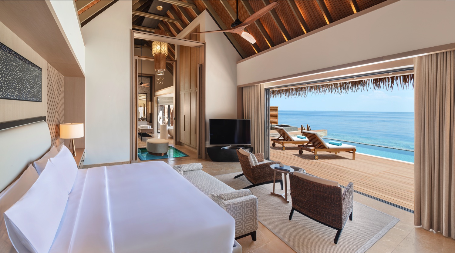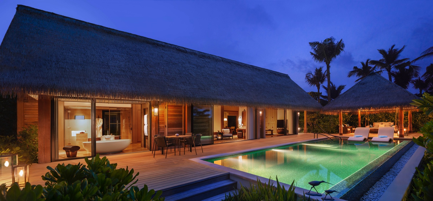 Ein privates Paradies mit einer Strandvilla mit drei Schlafzimmern, einer Überwasservilla mit zwei Schlafzimmern und einer Residenz mit vier Schlafzimmern und eigenem Whirlpool. Den maximal 24 Gästen stehen fünf Swimmingpools, einen Whirlpool, ein Unterhaltungsclubhaus, ein Spa, ein Fitnessraum, ein Kinderbecken und ein Spielplatz zur Verfügung. Ein Team von Köchen und persönlichen Concierges erfüllt alle erdenklichen Wünsche.