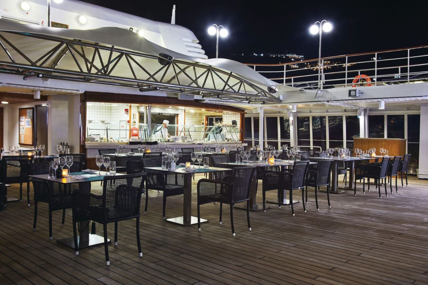 Das Hauptrestaurant The Restaurant bietet moderne, internationale Küche, kreiert von den Küchenchefs von Relais & Chateaux. Zusätzlich werden regionale Spezialitäten des jeweiligen Reiseziels serviert. Beste italienische Küche genießt man im La Terrazza, während das Le Champagne, das einzige Weinrestaurant von Relais & Chateaux auf See, beste Weine begleitet von regional inspirierten Menüs kredenzt (40 USD pro Person). Am Pool Grill & Bar gibt es leichte Speisen, Fleisch vom Grill und ofenfrische Pizza. Abends kann man am Tisch auf einem heißen Stein Fleisch, Fisch und Meeresfrüchte aller Art selbst zubereiten. Zusätzlichen laden diverse Lounges und Bars zum Verweilen ein: